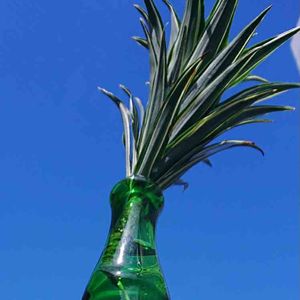 今日は快晴でした(^o^) 伸びて伸びてボーボーだったコンパクタさん 切って根っこ生やしました‼️ この瓶はアートバザールで見つけたおそらくジンジャエールの瓶を加工したものです
