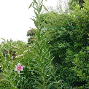 実家の庭ですが自慢出来るテッポウユリ。茎が倒れないように後ろのツヅジの枝でくくりつけてます。 軽~く2メートル越えております! ツヅジの下は石垣なんでそう考えるとこのユリ非常にデカイです!