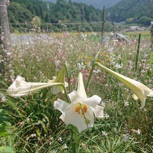シンテッポウユリ、咲きました💠✨ 後ろは空き地のガウラ💠 切り戻しもなにもしないけど、雨にも負けず風にも負けず、元気に立っています💠🌱⤴️⤴️⤴️