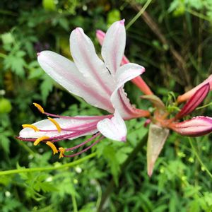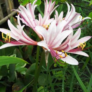 母の庭の夏水仙は クジャクシダを従えて美人さん 夏水仙ではなく リコリス インカルナータと教えていただきました。 模様があるのはタヌキの剃刀ともありました💕