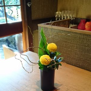 今月の生け花② あおもじ と ドラセナ と ガーベラ。 オレンジが映えます。