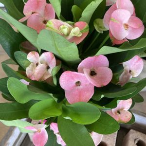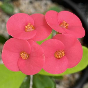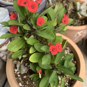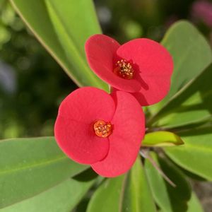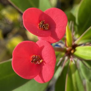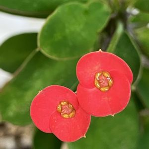 【今日のお花:ハナキリン】 浜松フラワーパークの温室のお花です🌸 めちゃくちゃ大きくて驚きます! トゲの大きさも凄かった🫢 マダガスガル原産とかで情熱的なお花ですよね❤️ 花言葉には「早くキスして」なんて いうのがある様ですが、花の形からなのかな🫦 最後の鉢植えが、うちの子ですが 鉢の色を花色に合わせてみました ほぼ一年中咲いてくれています😊