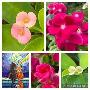 ᰔᩚ ᥫᩣ ハナキリンピンク ニチニチソウ コラージュしてみました💖 今月もありがとうございました もうオケツの日ですね🍑 暑すぎてなんだかスローな感じもするけれど小さな秋は感じています🦗🍁