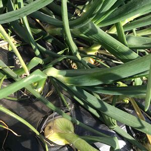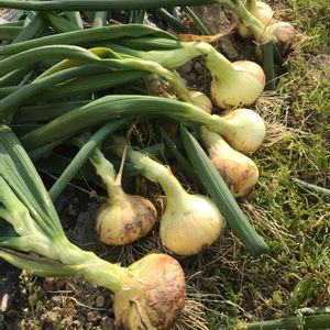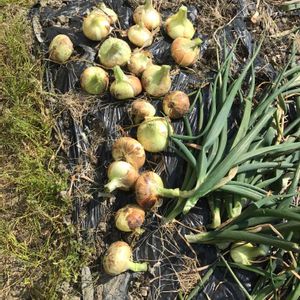 葉が倒れ始めたのもある新玉ねぎの収穫第二弾。10個ほどを収穫しました。 まだ、30個ほどあります。