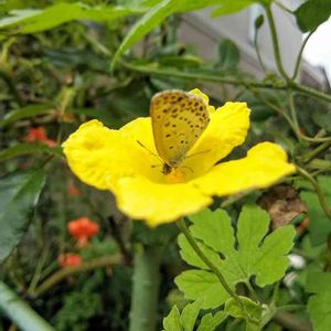 ゴウヤ ツルによって、雄花ばかり咲かせるものがある。 最近、昆虫が多くなったね。 シジミ蝶🦋 アブ アリ🐜(アリは最初から) 受粉しなくても、実を付けそうだな!