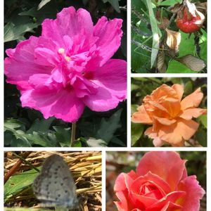 連投すみませーん🙏 今日のバラと庭のお客様(いや、主かな⁈) ↖️地植えの木槿が綺麗🌟賑やかです🌟🌟✨ ➡️スモークツリー の側の鉢植が、良い色です🧡 ↘️塩害で弱っていて昨年も不調、この綺麗さは初 かも🧡❤️ ↗️カマキリさん💚から茶色へ🤎変化してる様子 ↙️シジミチョウは小さいけど綺麗♪💙を撮りた いけど翅を開いてくれません!