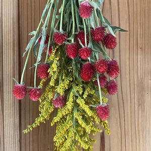 おはようございます😃 千日紅と、セイタカアワダチソウをスワッグにして、このままドライフラワーにします。