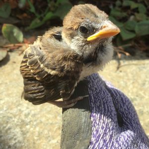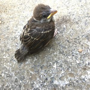 夕方、室外機カバーの棚に… スズメの雛🐧💦 巣立ちしたのか、巣から落ちたのか… 親鳥も近くにいたので、そうっとしておきました 猫や蛇やカラスに襲われないといいけどなぁ