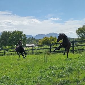 緑が眩しい牧場の昼下がり 2頭の馬が仲良くお散歩していました。 さすがは元競走馬✨ 走る姿にはうっとり😍💕 …と、突然こちらに向かって猛ダッシュ〜🐎🐎 躍動感のあるpicが撮れました👍 撮影 : ひるぜん高原 オールドフレンズジャパンにて