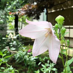 こんにちは。 梅雨明けした沖縄以外は これからしばらく梅雨空が続きそうですね。 いつもながら朝7時に東京にいる息子に モーニングコールしたら、スマホ越しに 聞こえる強い雨音に驚きました。 さて、 わが家の庭では、キキョウ(富士ピンク)が 咲き出しました。 グレーな梅雨空の中、 薄桃色のキキョウに癒されます。