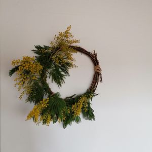 駆け込みクリスマスリース💛💚💛 23日になって慌ててクリスマスっぽい飾りをしてないことに気づき、仕事の帰り道に大好きなミモザが売られていたのでミモザのリースに💛 ベースの枝はしなるいい枝を拾って作った去年の使い回しです。 近所にもみの木マーケットで散々もみの木見てたにも関わらず買わず終い。いつでも買えるからと思ってると結局買わないんですよね… 次は正月の飾りかぁ。