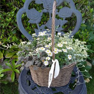 こんばんは🌃 天気予報によると、明日は朝から荒れたお天気になるそうですね☔ 皆さま、おでかけの際はくれぐれも足もとにお気を付けて🙏 さて、本日の📷投稿は、先日作った寄せ植えです😄 テーマは『野の花を摘んで』🤍🌿 仲良くしていただいている花友の皆さまに、月ちゃん🌛と私が花を贈るとしたら、山や野原に咲く素朴で可憐な花や葉っぱを集めた花籠がいいなぁ〜✨ そんな気持ちを込めて、野の花の優しい雰囲気をイメージして寄せ植えしてみました🥰 使用した花苗 ・ブラキカム『スープリームホワイト』 ・キンギョソウ『ムーンライトオブトリニティ』 ・ゲラニウム『セッシリフローラム』 ・タイム『ドレスホワイト』 ・ハゴロモジャスミン『ミルキーウェイ』 ・ディコンドラ『シルバーフォール』