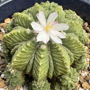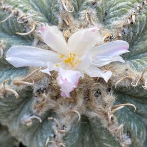 お疲れ様です! メキシコの希少サボテンアズテキウムリッテリ 花籠 開花しました❣️ 現地では絶滅しかけているようで実生で増やされたものが流通していますね! 花も可憐で可愛いですがなんとも言えないフォルムが魅力的です 名前のもとになったアステカ文明の壁画のような紋様、、ミステリアスで大好きです☺️
