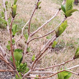 挿し木で貰って育てた苗を、庭に植えて3年目の紫陽花です。 芽吹いて来ました。