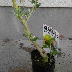 ■レモン ピンクレモネード このレモン、いい!と名札の写真を見て一目惚れ😍あれから苦節2年!?、3年!?。今ほど熱心に畑には通っておらず、スリット鉢に放置で虫に葉を食べられ続け、たいして大きくもならなかったピンクレモネードを、今年は地におろしてみました。順調に育ってはいたものの、相変わらず虫がよってきて、ぼちぼち葉は食べられてしまいましたが、日々駆除(手で取る)していたところ、ついに、一輪だけ花が咲きました😆実がなるといいんですけどね。 最高気温23℃、最低気温15℃ ・・・・・・・・・・ 以下、乙庭HPより 乙庭 2017春夏季 新導入種! 学 名: Citrus limon 'Pink Lemonade' 科名等: ミカン科 半耐寒性常緑樹(-3℃程度) 花 期:晩春〜秋 草 丈:2m程度 クリーム色の覆輪斑と迷彩状に白緑色の不規則斑が入る多芸で美しい葉、実にも緑×黄色の縞斑が入り、そして、果肉はピンク色で食用となり、自家結実性で1本でも実る、観賞価値が高く食用としてもたいへん魅惑的な、レモンの園芸品種です。 レモンは、いわずとしれた、食用柑橘類の代表格ですよね。ヒマラヤ西部のインド原産の樹木ですが、今日では南ヨーロッパやアメリカ西海岸地域など、世界の温暖地域で広く栽培されています。日本でも暖地で地植えで育てられ、緑濃い常緑葉で、晩春〜秋に咲く白い花も香り高く、その後、秋〜初冬に向けて実っていく黄色い実も観賞価値があり、食用としても役立つ庭木として園芸的にもおすすめの果樹です。 本種 ピンクレモネードは、葉と実に斑が入る、とても観賞価値の高い園芸品種です。葉には、クリーム色の覆輪と葉の内側には白緑色の不規則斑が入り、濃淡の迷彩状の模様を呈します。実は、初期の段階で黄色と緑の不規則な縞模様となり、果肉が熟すにしたがって、黄みが増して、レモン色の外皮となっていきます。果肉もピンクオレンジみをおび、食用としてもとても美しく料理を彩ってくれます。 耐寒性は万全ではなく、日本では関東平野部以南の温暖な地域で屋外越冬可能な樹木です。暖かい気候を好みますので、上記の地域でもなるべく日当たりよく、北風などから保護された暖かい場所を選んで植えるとよいでしょう。 実の食用も視野に入れて栽培する場合、花は晩春〜秋まで咲きますが、日本の冬の気温では実の成熟が止まってしまうため、晩春に咲いた花からできた実を初冬に収穫するサイクルが一般的です。初夏以降の花からも実がつきますが、成熟する前に冬となってしまうのと、多く実らせることで、初期の実の成熟や樹勢にも影響が出るので、初夏以降の花からできた実は、早い段階で摘果するとよいでしょう。 また、レモンは樹勢が強く、枝ばかりが伸びて実りにくくなることがあります。適宜、混み合った枝を根元からカットして枝数を減らす枝透かし剪定をすると、樹勢も適度に落ち着き、風通しもよく、 葉に光が当たるようになって、実付きが促進されます。 本種は、葉に斑が入るため、通常のレモンよりは樹勢も穏やかで、樹高も2m程度におさまる品種です。大きさ的にも扱いやすく、ガーデニング的にも多いに活用できるすばらしい果樹です。 ・・・・・ 以下、観音山フルーツガーデンHPより ・新品種 ピンクレモネード 「普通のレモンなら植えませんでした」 それは2013年から始まりました。 近隣のセイタカアワダチソウだらけの園地を借り受け、そこに今まで栽培されたことのない、未来を感じられるような新品種を植えようと考えました。 何か最適なフルーツは無いだろうかと苗木屋さんの資料をあさっていたところ、レモンなのにピンクの果実が出来る新品種が目に留まりました。 「これだ!」 様々なフルーツがあるなか、やはり当園の強みはレモンですので、そのレモンの中でも今までにない品種で未来の可能性を感じるレモン。 それがこの「ピンクレモネード」です。 ・・・・・ ね、欲しくなったでしょ😎 探して見てください😉