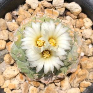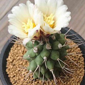 ストロンボカクタス 菊水 good_guyさんのプレゼント企画、 ケンさんのPOSTと甘言により まんまと足を踏み込んでしまったサボテン沼。 たぶん恐ろしいほど底なし沼です 先日伺ったサボテン農家さんで、 育て方を聞きましたが、 多くのサボテンは寒暖差が必要だとのこと。 ハウス内も35度以上あって、 我が家でこんな環境作れるかな? guyさんに相談すると、 サボテンの種類に応じて、 育てる環境も微妙に違うから、 あれもこれもと手を出さず、 ひとつ一つと向き合って環境づくりしながら 育てることとアドバイスもらいました。 だから、 この前もらったランポー玉と兜系、 それと牡丹系をベースに 手を広げないでおこうと誓ったのですが、 そういえばサボテン農家さんに行ったとき 肌色の美しさと繊細なトゲに惹かれて この菊水買ったんでした。 小ちゃな菊水なので 1個だけ見逃して (>人<;)