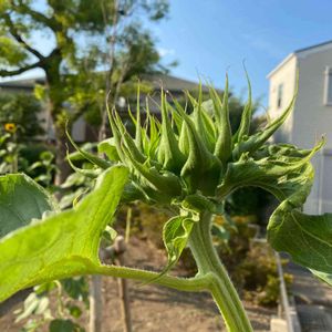 ※うちの子 「秒読み開始かな😳」向日葵 おはようございます。 日が出ると暑いので、その前にパチリ📸記録は、自分の背丈を超えました😱 今年は、良い種も穫れるかもです🌻