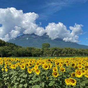富士山に雲がかかって残念ですが…💦 青空の下に咲く12万本のひまわりに感動しました🌿