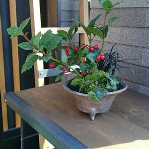 今月の盆栽教室(豊橋) お正月用の寄植え🎍 黒松・長寿梅・笹・バイカオウレンで、松竹梅の盆栽が出来上がりました。花は紅白で咲きます✾おめでたいですね✨