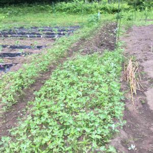 そばと、もち大麦を畑の端っこに蒔きました。 蒔き終わって帰り支度を始めたところ、山からハトが出てきたので、見張られていたわけでは無いでしょうが、もしかしたらタネ食べられちゃうかも?と思い、急遽不織布で畝をカバーしました😨。 畝の端にキタアカリをちょこんと配置。 もち麦はおろか、麦育ててる人なんてこの辺で見ないからなぁ。。色々調べたけど、結局見切り発車です。