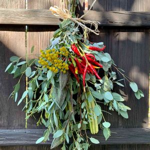 庭の秋スワッグ 鷹の爪 イソギク ユーカリ ユリの種 花オクラの種 秋の庭.畑から収穫して 束ねてみました