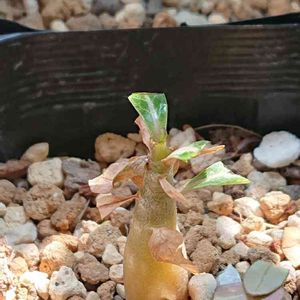 【実生記録用】 壁]ω`)オハヨーゴザイマース 昨年末に蒔いた初挑戦のアデニウム・ソマリエンセ、葉っぱを半分に切ってやるとボディの葉緑体を使って塊根部分が太りやすくなるとの怪しげな情報を頼りに全ての葉っぱをハサミでカット、さてどうなる事やら (◉ω◉)