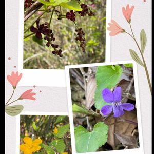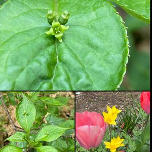 ⬆️上は 三つ葉☘️アケビのお花はワイン色🍷 中は すみれ(タチツボスミレ)💜🌿 ⬇️下は 山吹のお花💛🌿 知らないうちに沢山咲いています💛💜🌿 🍋🌱🍋