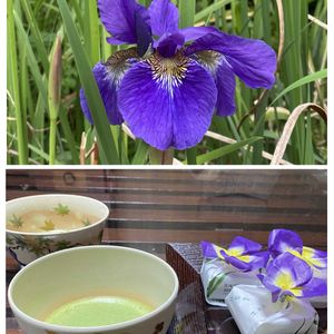 大型連休も明日で最後の日ですね。 このお花は あやめ です💜🌿 「今日のお花」は菖蒲、花菖蒲では無いのですが姿が似ているので! 下は和菓子屋さんの「菖蒲餅」と言うお菓子です🍡お抹茶でどうぞ🍵 今日は 子供の日🎏兜の抹茶碗を使ってみました🍵🎏 🍋🌱🍋