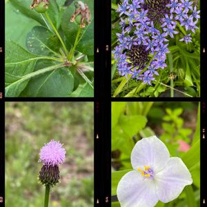 ↖️左上 姫りんご🍎の実が!受粉に成功しました♪ ↗️右上 シラー・ベルビアナ💜🌿 ↙️左下 キツネアザミ? ↘️右下 シロハナムラサキツユクサ🤍🌿少し紫色が入っている様な気がします。 🍋🌱🍋