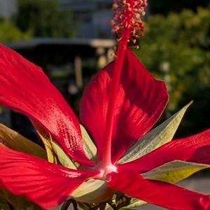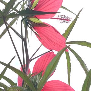 9月は長月(ながつき/ながづき)、夜が長い月という 夜長月(よながづき)が略されたといわれている秋が深まる月。 これは旧暦、現在でも使用されることもあるが、現行歴とはその1〜2月後位の季節感のずれがあるという。 私の散歩道の道際等の草花達は、今年も異常とされようか、その熱く強い日差しから解放されることを願いながら、より充実した自己表現に向けて、それぞれが個性ある色彩をより長く放そうとしているようだ。 8月からの、熱さから解き放されるを願っての草花たちの姿 ---その12。 /長い ‘シベ’ 筒状合着5裂して、 圧倒するや背高真っ赤な5弁花/ 9月は上旬。9月に入っても秋風がなく、まだ残暑厳しい毎日。 所用の帰り。熱暑を少しでも回避すべく、日陰を貰おうと、失礼してある緑の中の団地に入って歩を進める---ひと続きする住居の側面に、何か幾つかの赤いものが目に入る。何故か胸が躍り足早にそこへ。 そこには、圧倒的に ‘真っ赤な色彩を放つ’ 草花に出逢い観たのであった。 それは、大きな ‘赤い5つの花弁’ を大きく広げ、その中心には特徴的な柱状の雄しべが長く突き出して、それが筒状になって、その先端に雌しべが。 その ’雌しべの柱頭は5裂’ して、それがくっ付いて合わさった(合着した) ‘柱状のしべ’ を長く突出して、その花姿は同属のあの花によく似ていた。 モミジアオイ(紅葉葵) <‘モミジアオイの近縁種’ について、下記の「モミジアオイ」より抜粋•出典 、次に: 観賞用として栽培されているフヨウ属の代表的な植物には、本種の他以下のようなものがある。 *アメリカフヨウ(アメリカ芙蓉) *フヨウ(芙蓉) *ローゼル *ムクゲ(木槿) *ハイビスカス > ・モミジアオイ<紅葉葵、別名 コウショッキ<紅蜀葵>>(アオイ科 フヨウ属/ハイビスカス属) (備忘: モミジアオイの属性等について 8/16or8/17 ‘21) 上記の“モミジアオイ“の属性等は、今後は下記の「モミジアオイ」の属性等が取り替わる。 ↓ ・モミジアオイ<紅葉葵、別名 コウショッキ<紅蜀葵>>(アオイ科 フヨウ属/ハイビスカス属) 北アメリカに分布する多年草。 分布域はアメリカ・アラバマ州、ジョージア州、フロリダ州などにあり、沿岸平野部の湿地や沼地などに自生している。 沼地に多く自生することから、沼地のハイビスカスとも呼ばれている。 日本へは1870年頃に渡来し、庭に植栽されるなど普及している。 モミジアオイの花期は7月~9月。 花期になると、茎の上部の葉の付け根から花柄を伸ばし、花径10~20㎝程度の大きな花を咲かせる。 花弁は5個あり、長さ7.5~10㎝、幅2.5~5.5㎝の狭いへら状倒卵形で、平らに開く。 雄しべ、雌しべは合着して長い柱状となっている。 雄しべは柱の途中からブラシ状に多数付き、その先に雌しべの柱頭が突出する形になる。 雌しべの柱頭は5裂している。 萼は長さ3.5~6㎝で、5深裂し、裂片は狭い三角形。 萼片の下に線状の小苞葉が多数付く。 花は一日花だが花期の間次々と開花する。 花色は基本種の赤のほか、白、ピンク。 近年ではアメリカフヨウとの交配種で、花弁の幅の広い品種も流通している。 果実は長さ2.5㎝~3.5㎝、先が尖った卵形~楕円形の蒴果(さくか)。 蒴果(さくか)…乾燥して裂開し、種子を放出する果実のこと。 複数の心皮からなり、熟すと心皮と同数に裂ける。アサガオ、ホウセンカ、カタバミなどに見られる。 果実は熟すと裂け、中の種子がこぼれる。 種子は褐色で、直径2.5~3.8㎜の球形。 葉は互生し、長さ10~19㎝、幅13~25㎝の大きさで、掌状に深く3~5裂する。 茎はあまり分枝せず直立し、草丈1.5m~2mに成長する。 和名の「モミジアオイ」は、この葉の形とアオイに似た花姿に由来する。 耐暑性、耐寒性共に高く、強健な性質をもつ。 真夏の直射日光にも負けない強さがあり、育てやすい植物。 冬に地上部を枯らせて宿根し、春に再び芽吹く。 <モミジアオイの近縁種> モミジアオイが属するフヨウ属(ハイビスカス属)は、熱帯・亜熱帯地域を中心に約250種が分布している。 観賞用として栽培されているフヨウ属の代表的な植物には、本種の他以下のようなものがある。 *アメリカフヨウ(アメリカ芙蓉) *フヨウ(芙蓉) *ローゼル *ムクゲ(木槿) *ハイビスカス (出典・参考: ガーデニングの図鑑)