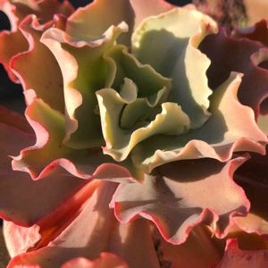 ジャイアントブルーという名前のエケベリアなのですが、超ピンクです。。 紅葉が可愛らしい。 ひらひらが乙女。名前は男らしいのに。