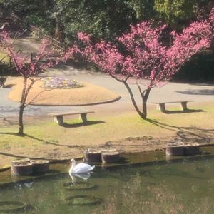 久留米市美術館の2Fから見た中庭です❣️ 大きな池があって周りに梅の木が何本もありました🌸