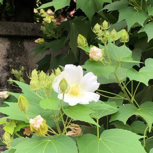 芙蓉🌳 ふよう よそ様の駐車場 ☁️☁️今朝は微風、ちょっと過ごしやすい♡ 近頃歩かない道沿いに真っ白に咲いてる✨✨美しい🤩