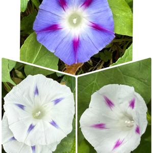 💙つる性植物🩵ヒルガオ科💜 一日花 ①ミルキーウェイ(西洋朝顔) 白地に青紫の放射状模様 時間が経つと赤紫色に変化 ②③コンボルブルス 別名 西洋昼顔 漏斗形の全開 ④野に咲く小さな花💙 ⑤家の小さな朝顔(こぼれ種)