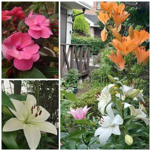 今日の庭の花達 ( 1 ) インパチェンス はプランタンで 白い百合の花が 新しく参入しました🤗