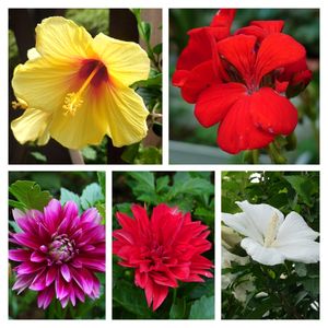 今日の庭の花達 ハイビスカス ゼラニューム ダリヤ紫と赤の 花びら 白のムクゲ 再び咲き始めました 🤩