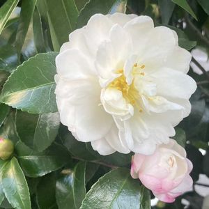 椿かな と思ったのですが サザンカ 白くて 蕾の時はうっすらピンク うっとりします これからいっぱい咲いてね