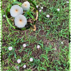 ドッヒャ〜 キノコ🍄🍄🍄🍄🍄 我が家の薔薇の木に大きな白いキノコ🍄 ニョキニョキ、5個も😅👍 全部食べられるキノコなら嬉しいのに 絶対毒キノコだよね😱 1 0センチから15センチもあるよ〜 ビックリ⁉️🤣🤣🤣
