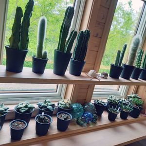 模様替え サンルームにいた柱サボテンが邪魔だったので、いやいや💦ここに置いた方がかっこいいかなと思ったので😉お引っ越し💨 棚も新たに作り直したらたくさん置けるようになりました🙌