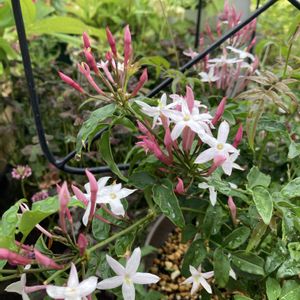 こんにちは♪ 我が家のハゴロモジャスミン 初めての冬越しに失敗して だいぶ枯れ込んでしまいました 枯れた部分をダメ元で全カットして植え替えしました✂️ 復活して蕾も付いてお花も咲いてくれました😊 よかった〜!୧(⁎˃ ᵕ ˂ )୨⁾⁾💕