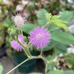 ①オジギソウの花が咲いた やっと…😭 2年前の種を発見して蒔いてみた すぐに発芽したけど なかなか大きくならずにヤキモキ💦 しかも友達にあげたオジギソウは モリモリ大きくなって たくさん花をつけてたのに😅 でも小ぶりながら可愛いし 蕾もまだあるから楽しみ(*´꒳`*)♡ ②アドニスダブルオレンジも 雨の中綺麗に開花🧡 ③ケイトさんも💜