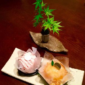 モミジの超ミニ盆と大好きな桃ケーキのダブル❗️ 美味しい物を食す時には緑も一緒に。。。 ( ´͈ ᗨ `͈ )◞♡⃛ すみませ〜ん、あまりの美味しさ、、UPしたくなっちゃいました〜お祝いなので❀.(*´◡`*)❀.