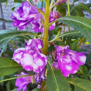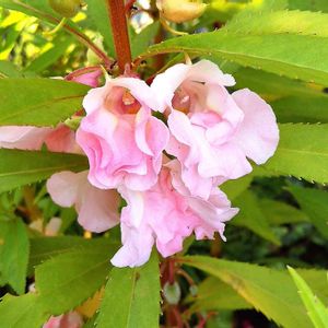 ホウセンカ(鳳仙花)です。 葉の縁がギザギザです。種ができかかってます。 子どもの頃 種が弾ける様子が面白くて よく触って遊んでました。