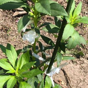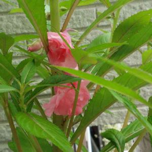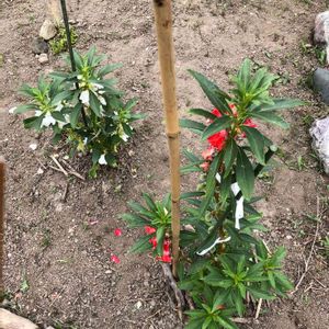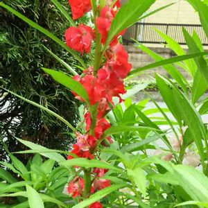 ホウセンカ、 今年植えた中で1番元気に開花している。 白はあまり伸びないタイプなのかも。 赤は添枝棒を越したので長い竹も添えました。