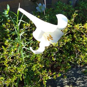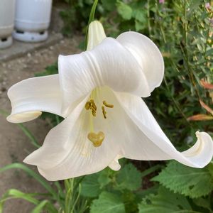8月7日撮影 グリーンスプリングス 白いユリが一輪。 ちょっと前までのわたしなら、 赤い筋が入っていないのでテッポウユリ! …と思っていたと思いますが ひめうつぎさんのところで拝見したユリに らにいーさん ムラタヌキさんが コメントしていらっしゃるのを 図々しく横から読ませていただき、これはタカサゴユリとテッポウユリを掛け合わせたシンテッポウユリでは!?と思えるようになりました☺️ これって〝門前の小僧習わぬ経を読む〟ということ…?と思って調べてみましたが、こんな図々しいことではありませんでした😅 このことわざにも失礼いたしました。 ひめうつぎさん らにいーさん ムラタヌキさん 大変失礼いたしました。🙇ありがとうございました😊 シンテッポウユリ ユリ科ユリ属 花の時期はテッポウユリは6月。 タカサゴユリは8月〜9月。 テッポウユリの花弁は白い。 タカサゴユリの花弁は外側に赤い筋が入る。 テッポウユリの葉は幅広。 タカサゴユリの葉は細い。 これは花が8月に咲き、花は白く、葉は細い。 中間の性質をもっているのでシンテッポウユリでしょうか? どうやらタカサゴユリも変異で筋の入らない白い花を咲かせることがあるようですが。 (以下は mirusiru.jp より)↓ 日本在来種であるテッポウユリと台湾原産の外来種タカサゴユリ(高砂百合)を交配させた園芸品種群(を元に更に交配・改良された園芸品種群)。別名ホソバテッポウユリ(細葉鉄砲百合)。テッポウユリの高い知名度および人気と純白で大輪になる花の美しさ、タカサゴユリの花期の遅さとタネを播(ま)いてからたった一年足らずで開花に至る圧倒的な成長の早さ(お盆向けに出荷する切花の生産にたいへん有利)、という双方のオイシイところを兼ね備えた製品である。その後も、花の見た目は日本人に長らく愛されてきたテッポウユリに限りなく近いものに、そしてタカサゴユリの花期の遅さ・成長の早さという特性は維持し、という路線をベースに更なる品種改良が続けられている。となると、どれがタカサゴユリで、どこからがシンテッポウユリなのか線引きすることが困難となってくる。 一昔前まではじつはすべてひっくるめてタカサゴユリと呼ばれていたが、今は逆転してすべてがシンテッポウユリと呼ばれる傾向に。 シンテッポウユリは現在、神奈川県内のみならず全国的に帰化植物として道路沿いなどにたくさん生えてしまっている状況にある。民家で栽培されていたものが逸出したとか、ワイルドフラワー緑花工法に使われた名残りだとかいうが、そうなるに至った原因はよくわからない。保護すべき在来種など最早存在しないような都市部に多いので侵略的外来種として目の敵(かたき)にする必要は今更ないかもしれないが、他のユリと交雑してしまう可能性は問題視せざるを得ない。なおシンテッポウユリは連作に弱く、繁茂していた場所から忽然(こつぜん)と姿を消すことがあるとかないとか。