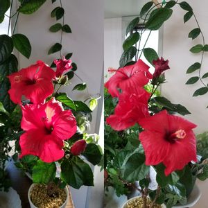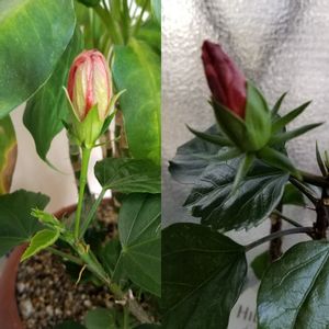 おはようございます。 ハイビスカス NEWロングライフシリーズアリオン 鉢増し計画が、花が咲きそうで、延期しました。 右上が、3月29日 左上が、今日です。 蕾が、少し伸びほっそりしました。 今は、4号鉢 花が終わったら6号鉢増し予定です。 ハイビスカス赤八重 一年中咲いてくれてますね。 右下3月19日に、咲いてから、半月 左下、今日の赤八重また、蕾が、1つ色づき始めました。 この子も、鉢増し予定なのに、なかなか、準備ができず、この花が、終わったら、鉢増しします。 今は、5号鉢 次は、7か.8号に、鉢増し予定です。