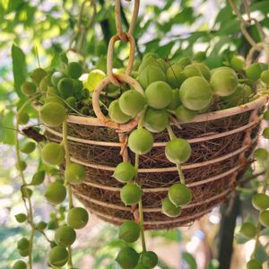 🟢グリーンネックレス🟢 今日のお花としてGS紹介されていたので🥰 ずーっと、ここ。 このスペースだけでいくつハンギングしているだろう🤭 上下関係は、 上からビカクシダ①号、オタマ多肉寄せ植え、このグリネカゴ、グリネ苔玉、ビカクシダ②号、 あ、アジサイのドライフラワーも掛けてた😅