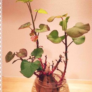 おはようございます😊 1個だけ、使い忘れたさつま芋🍠 知らないうちに芽🌱を出していたので、水耕栽培😊 葉っぱの色も味がある。根っこも、可愛い✨