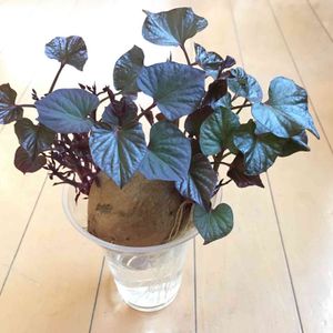 安納芋のその後です🍠 ミニストップのハロハロの容器に乗っけて水耕栽培にしてみました(*´∀`*) 芋がぴったりサイズ|( ̄3 ̄)| 水につけたらすぐ根っこにょきにょきのびてくるんですね〜 数日で葉っぱも結構開いて、なかなかいい色合い♫ 他のサツマイモより紫が濃い