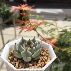 【毎月20日は勝手にチワワの日】 こんにちは〜(。・ω・。)ノ✨ はいっ、と言うわけで今月も20日がやってまいりました🎶 今月のチワワちゃんは「ニコチワワちゃん」です❣️ フォロワーのyukoさんがcoco et nicoさんのイベントで代理購入して下さった、思い出のチワワちゃんです(*ฅ́˘ฅ̀*) 綺麗なグリーンの葉と、濃いピンクのツメが可愛いなぁ〜😍💕 小ぶりでも美人さんなので目を引きます💖 庭の紅葉も一部が紅葉していました🍁 これからエケベリア達もどんどん綺麗になってくれることと思います😊 今年は悲しみの多い夏でしたが、残ってくれたコ達と幸せな秋を楽しみたいです🎶